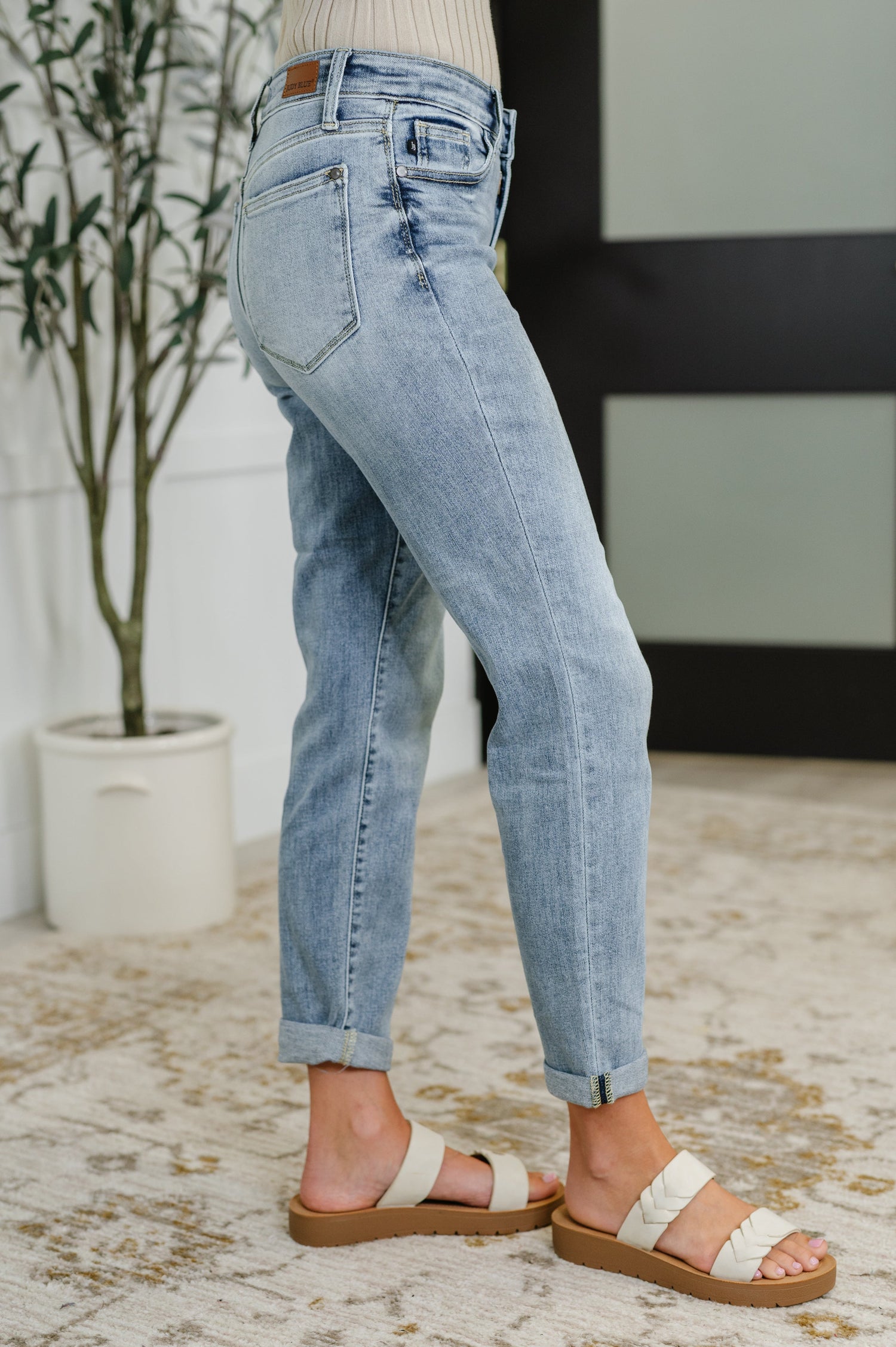 The Mallory Mid Rise Bleach Wash Boyfriend Jeans are the perfect everyday denim! A stretchy, light wash denim shapes a mid rise waist with zipper fly and five pocket cut. Relaxed pant legs with lived in fading fall to ankle length, cuffed hems. Cuffs can be unrolled.